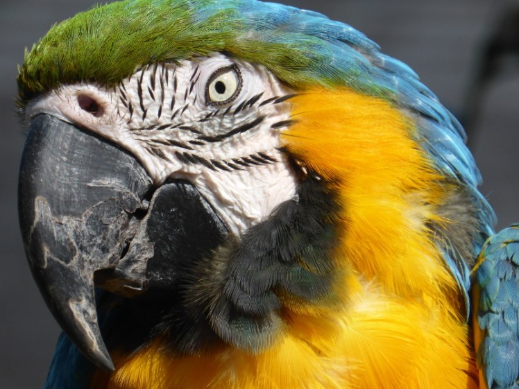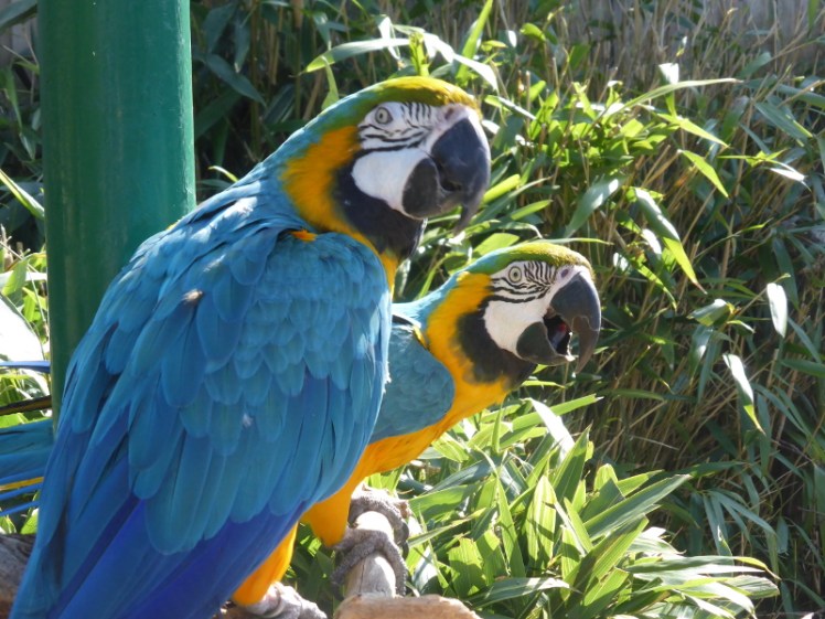 First thing in the morning the parrots are out on their perches, preening and shrieking at passers-by. After that, they go into the shed to do a show every hour, pushing trolleys, riding rollerskates, counting and otherwise occupying their fantastic brains.