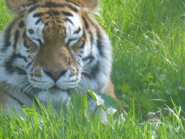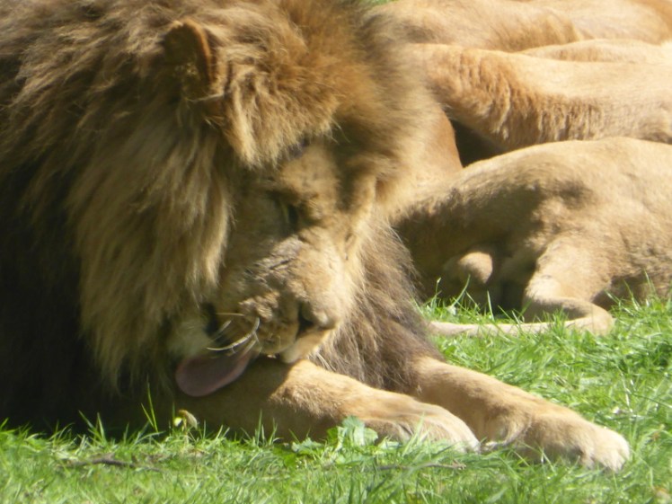 Now it’s time for the long queues to get into the big cat areas. These are separate by sets of double gates so the traffic builds up here, especially if the cats are sitting around in easy visibility. The tigers, two sisters, tend to be a bit elusive at times but there are twenty-something lions in two prides and you can always see the twelve accidents from 2014 in their special area – they had a contraceptive failure on an epic scale and now have to keep the teenage lions separated from the fully-grown adult lions for everyone’s own good. The adult enclosure is a lot more wooded and the juvenile enclosure features a lot more sunbathing space. There is a cheetah or two and finally, there’s a pack of timber wolves. It’s quite the experience to glance in your rear view mirror and see a lion prowling between the cars.