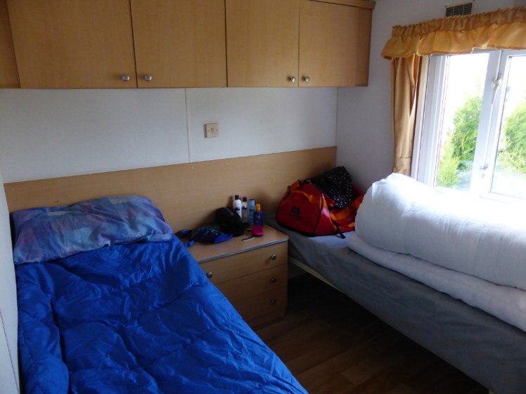 We settled into the caravan. From the moment we booked it, the entire extended family assumed my Dear Sister would have the master bedroom because “she’s used to having a double bed to herself” and I objected strenuously to this, to the automatic assumption. However, when we arrived, I discovered there’s hardly any room around the bed and opted for the twin room, where there’s plenty of space between the beds – I never accidentally punched a cupboard while attempting to get dressed. The downside is that the twin beds are incredibly narrow. I may not have punched a cupboard but I did headbutt the walls frequently and you have to press yourself against the wall before starting the turning-over manoeuvre. A colleague suggested excitedly that I could use the other bed as storage and “just live out of the suitcase” but it’s been a while since I’ve been in the same place for a whole week and you bet I was unpacking. Outer layers hung up in the little wardrobe, t-shirts and trousers folded in the second cupboard, books and pens in the first cupboard, electronics in the top drawer and laptop in the second drawer, washbag and towel hung on the back of the door. Very tidy.