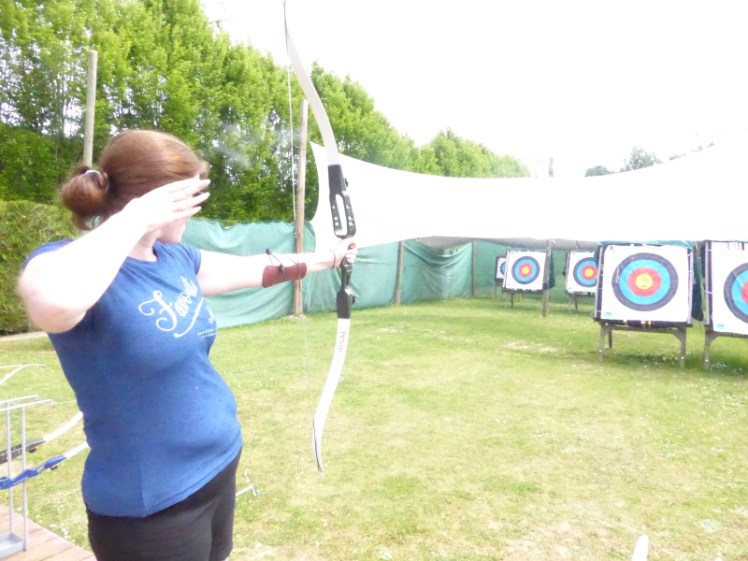I also booked us an archery session. Despite holding an instructor qualification, I don’t get to shoot very often and I wanted to play with a bow and arrow. There were five targets at three distances and because there were two little kids in our group, we got put on the middle target – which is far too far to hit with any accuracy with the little training bows. The kids’ dad was on the furthest target, with a shiny looking bow that turned out to be a 66 inch 18lb training bow – Odin only knows how he even hit the target with that. I could only hit the middle target by aiming at the curtain over the top rather than anywhere as low as actually at the target. At the end of the session (having left with two new games for my archery bag), I posed for a photo with one last arrow and put it straight in the gold of the closest target, so I can shoot when I’ve got a hittable target.