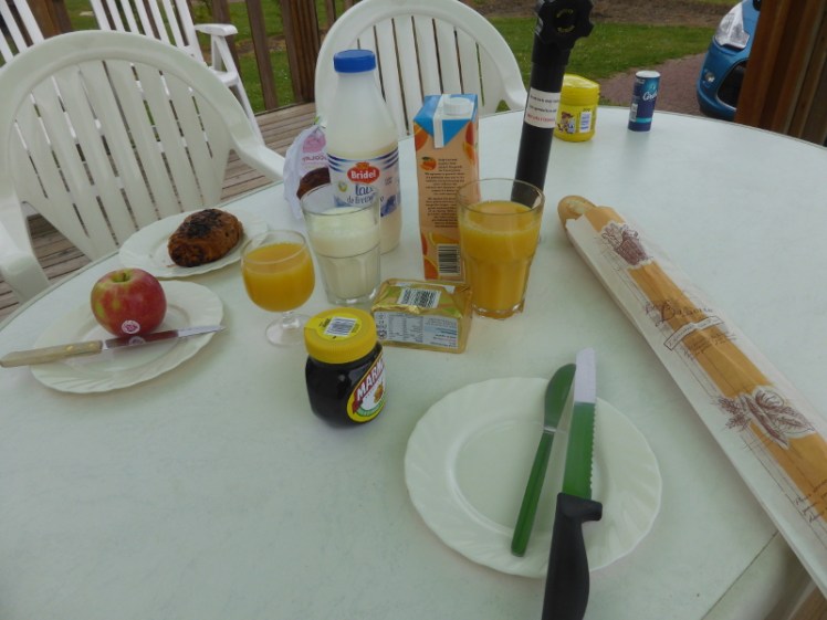 What I’d been most excited about, because I’m ridiculous, was eating my breakfast on the balcony – by which I mean the decking that has replaced the aluminium steps to the caravan. The picnic table & chairs now sit on there rather than on the pitch next to the caravan and the caravans are now widthways rather than lengthways so the pitches feel bigger and more open than they used to. So every morning we got up, walked to the campsite shop for fresh baguette and pastries, walked back (found that I’d completed two lights on my Fitbit before I’d even had breakfast, the campsite is so big nowadays) and had fresh bread and orange juice outside every morning – well, most mornings. One day it had been a touch rainy overnight and two mornings it was very rainy overnight so the table and chairs were wet and we had to eat inside. This is a bad idea because cutting a fresh baguette, if you’re not extremely careful (and I don’t have that sort of care in me), can make a lot of crumbs.