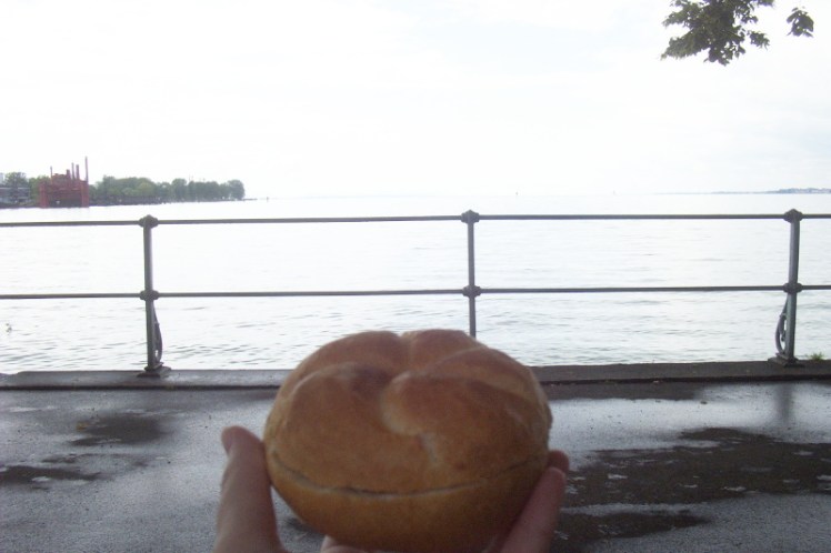 Number one was a bag of semmels. I don’t speak German and I think semmel just means “roll” but I was specifically after the variety split into five segments which Wikipedia tells me is probably called a kaisersemmel. I’d come equipped with a mini packet of butter and some marmite and a knife and I sat on a bench by the lake in the rain and had a little picnic.