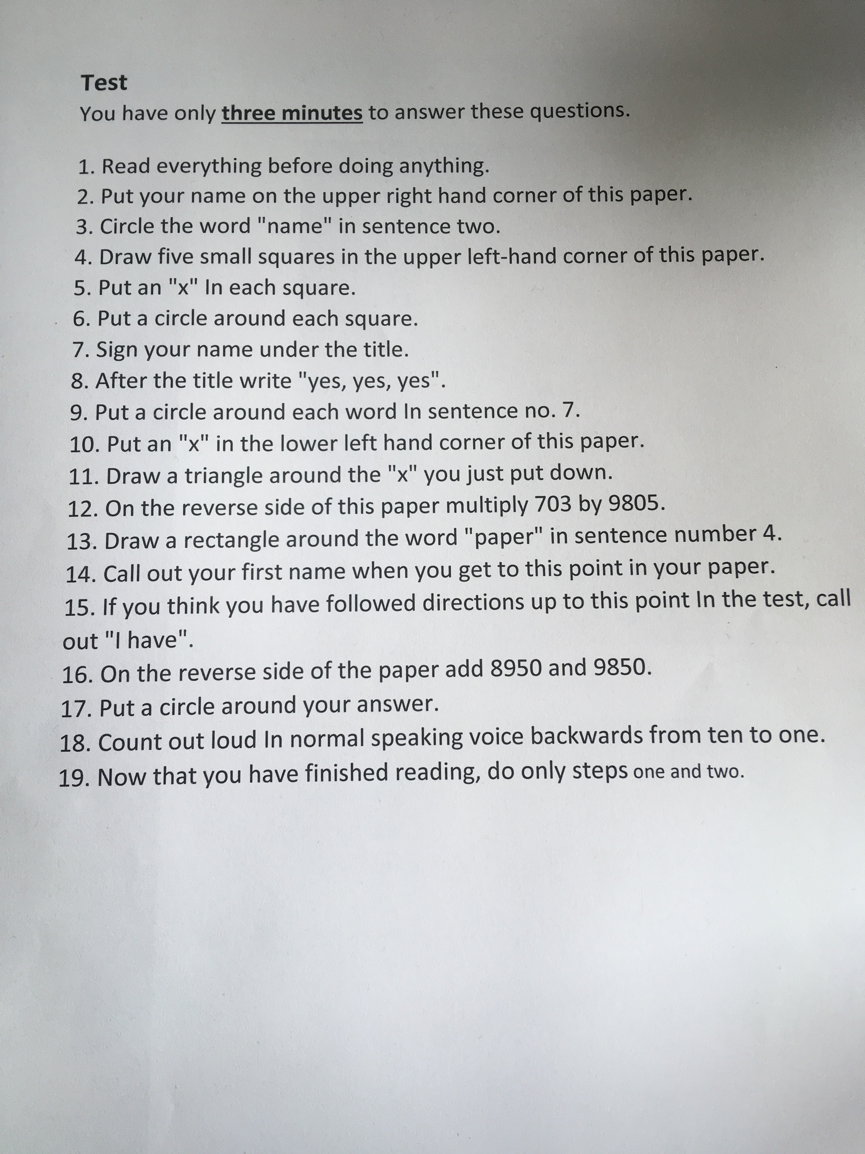 We were given three minutes. It started with “read everything before doing anything”, went through a variety of small tasks like “draw five squares in the corner”, “circle [x] word in Q[y]”. “shout your name out loud”, “draw circles around your five squares” etc and finished with “When you’ve read everything, only do Q1 & Q2.”