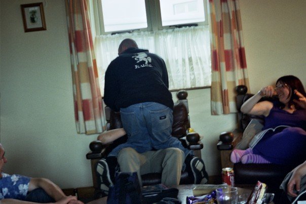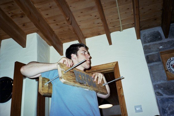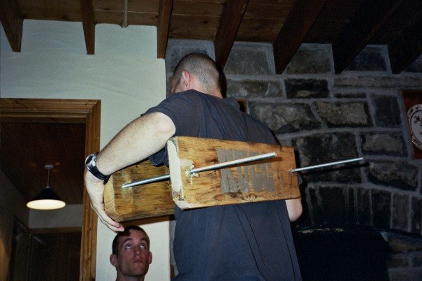 Cavers love squeezing. The squeezebox was built by Paul and is, to the best of my knowledge, still used by the club sixteen years later. It’s just two planks joined by two very long bolts and two wingnuts. The idea is to put it over your head, pull it down your body and step out of it and it’s tightened by a turn or two of the wingnuts until there’s a winner. The planks aren’t actually attached so you’re guaranteed to get clonked on the head trying to get into it in the first place and post-caving bruises are far more likely to be caused by this contraption than any actual cave. I’ve also seen squeezing done with a wire coat hanger, a bike lock and of course, any chair, banister or gate that comes into view. The great advantage of the squeezebox is that if you get really stuck, you can be released by your merciful friends.