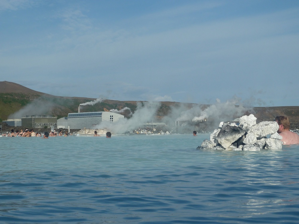 Svartsengi, the geothermal power station, as seen from the Blue Lagoon. They sky is blue, the water is even bluer and in a cloud of steam, a grey building, stubby cooling towers and something silver can be seen.