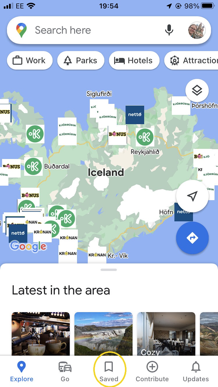 Google Maps app screenshot with the Saved icon circled in yellow. The map, obviously, is my Iceland supermarket map Posted on February 19, 2022December 6, 2024 by Julie Google Maps app screenshot with the Saved icon circled in yellow. The map, obviously, is my Iceland supermarket map