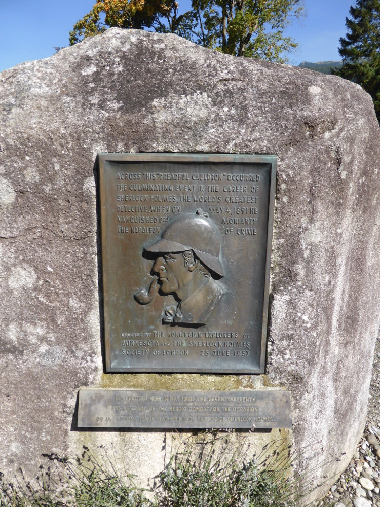 The Sherlock Holmes plaque at the Reichenbach Falls viewpoint Posted on January 8, 2022December 6, 2024 by Julie The Sherlock Holmes plaque at the Reichenbach Falls viewpoint