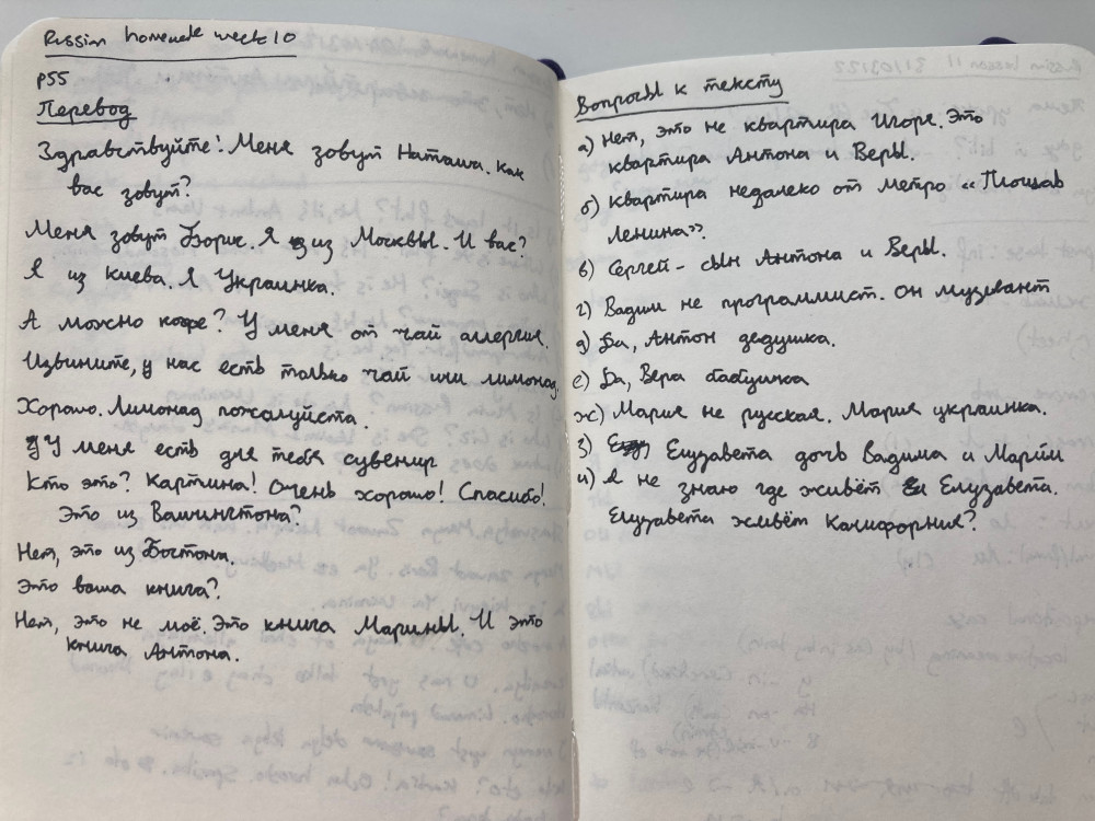 My week 10 Russian homework. Two pages of neater handwriting – a translation on one side and answers to a set of questions on the other.