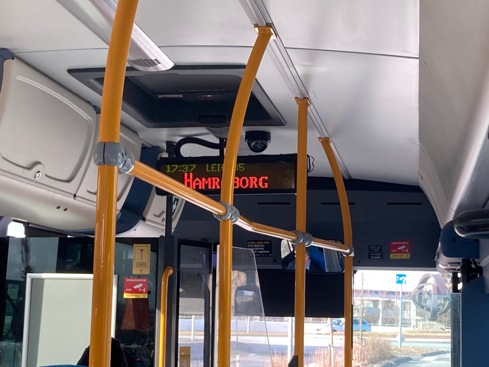 An LED sign hanging from the ceiling of the bus saying “next stop, Hamraborg”. Posted on May 25, 2022December 6, 2024 by Julie An LED sign hanging from the ceiling of the bus saying “next stop, Hamraborg”.
