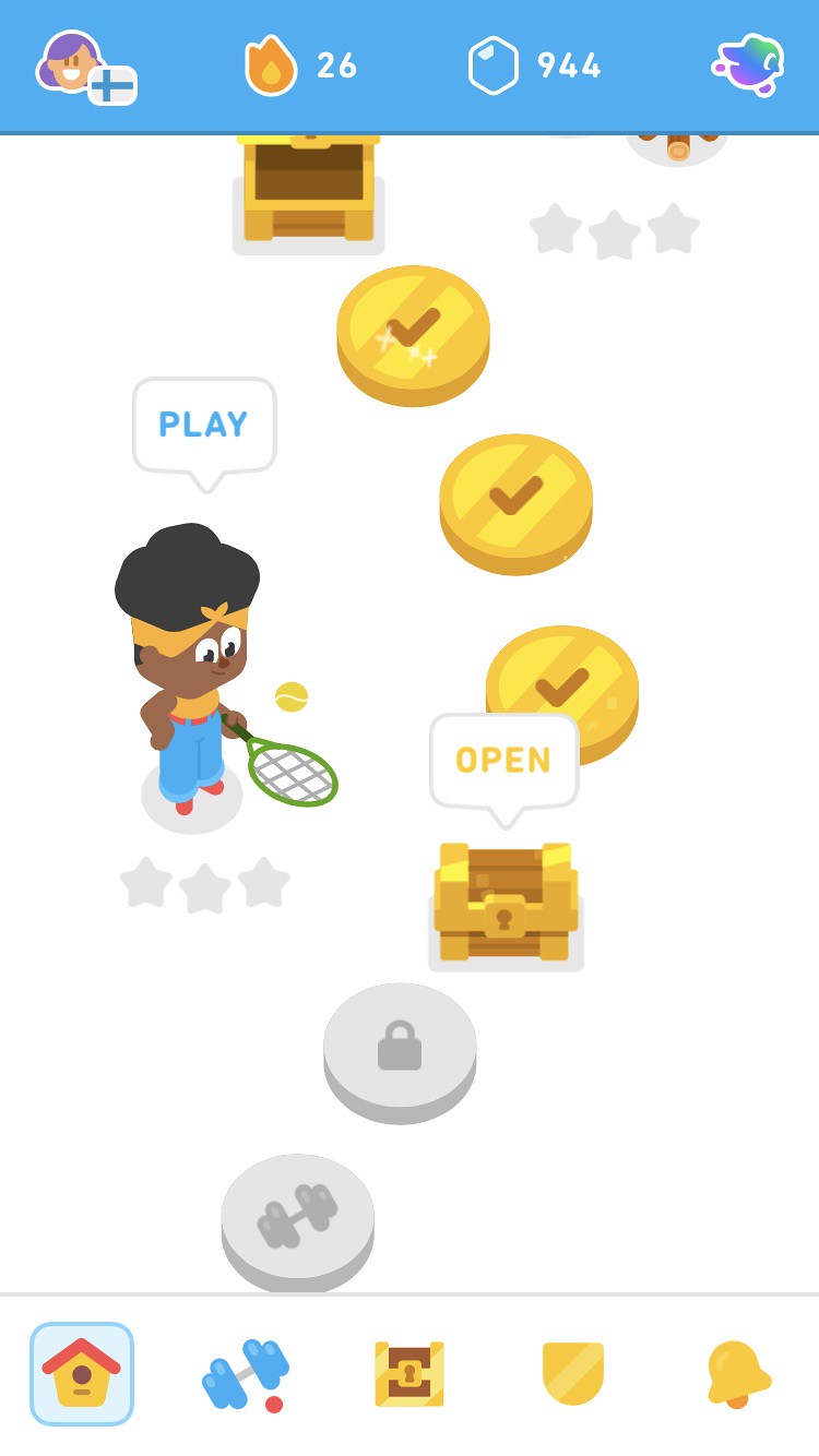 Duolingo’s new learning path. A line of circles wiggles its way down the screen. All the ones in the top half are gold and marked with a tick. The lower ones are grey because I haven’t done them yet.