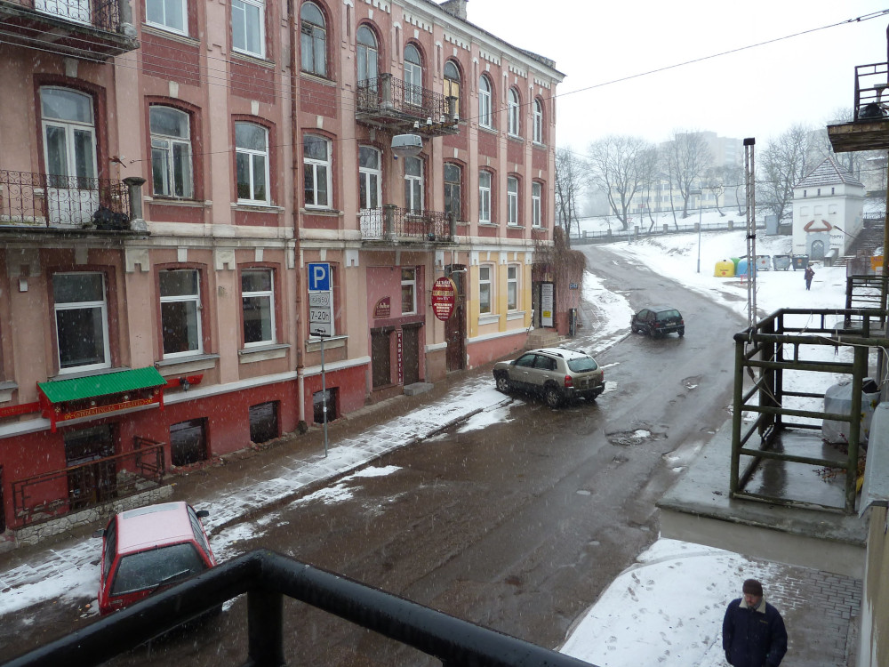 The view from my Vilnius hotel balcony, looking up the snowy street towards the station. It’s actually quite pretty but this is the unsalubrious part of the city.