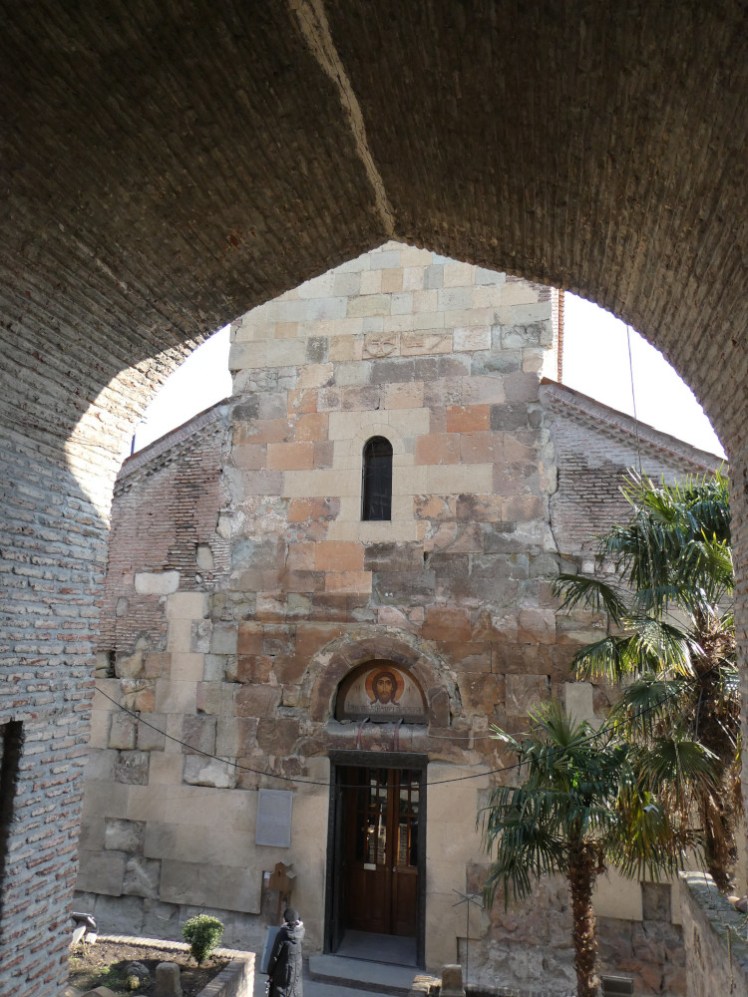 From here, we could see all the buildings built up and up above the valley, with overhanging wooden balconies. These are something of a Georgian trademark. Other countries have balconies but they’re not Georgian balconies, which are made of wood. Balconies are something of a social status symbol and it took a while to realise that when Lela talked about decorations on balconies, she wasn’t talking about pretty tables or pot plants – she means how ornate the balconies are. We crossed a small bridge and went up a spiral staircase to find ourselves in a narrow street winding its way through the Old Town, overhung with more balconies. Stopping a tour group here to talk about the area isn’t ideal. We saw Tbilisi mosque – not the beautiful blue-tiled thing you’ll see if you google it. That’s Chreli Abano bathhouse. I gather that this is now the only mosque in Tbilisi and that it’s unusual in that Sunni and Shia both worship together here.