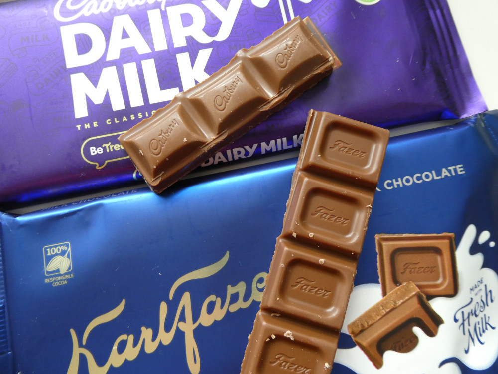 Dairy Milk in its purple wrapper with Karl Fazer in its blue wrapper. There is a stick of each lying on top. Posted on May 22, 2024December 6, 2024 by Julie
