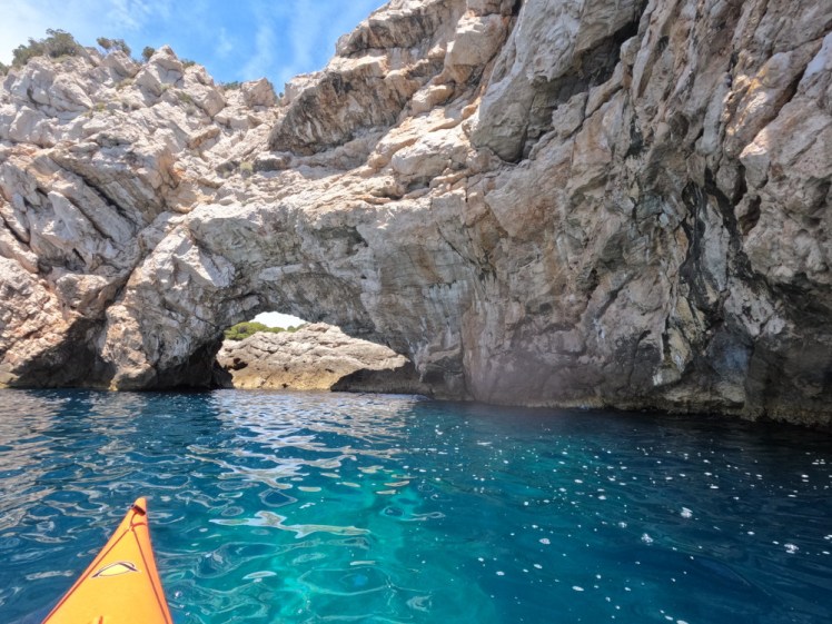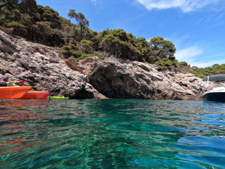 Our third stop was lunch at Suđurađ, the little port on the south coast of Šipan. The rest of the group had voted to make a reservation at a tiny fish restaurant and although restaurants really don’t work for me, I went along mostly because I really wanted a cold drink. My own pineapple juice, strapped to my decklines, had turned into pineapple tea under that sun and a glass bottle of Fanta was hugely appreciated. The waiter brought bread and butter without even an odd look and my companions never said a word so that was wonderful, and then we had to get back in the kayaks for our last stop. We had to be back on Lopud for the 6.10pm ferry, the last one of the day, and it was 3.30 by now. We were going to paddle across to Ruda, an uninhabited cone-shaped islet opposite Suđurađ, and visit another cave and then we’d have to go straight to Lopud.