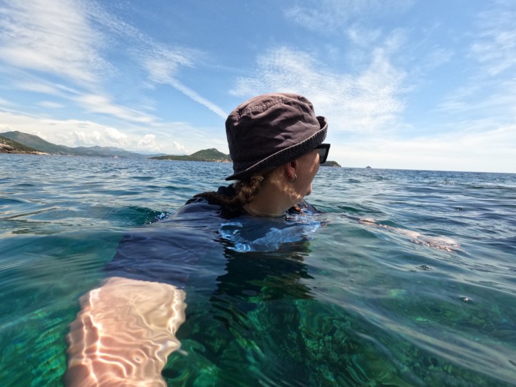 But I quite enjoyed my impromptu swim in the Med. I’m definitely an on the water kind of girl rather than in and I enjoyed the novelty of swimming in such gorgeous water, even if it was colder than I expected. I was still wearing my buoyancy aid when I half-jumped half-fell in and it’s probably a good thing I was because I’m prone to cold shock, which is why I usually get in slowly and gently. Plus, after paddling for a mile and a half or even two miles by now, under the blazing Mediterranean sun, it was a welcome opportunity to cool down.