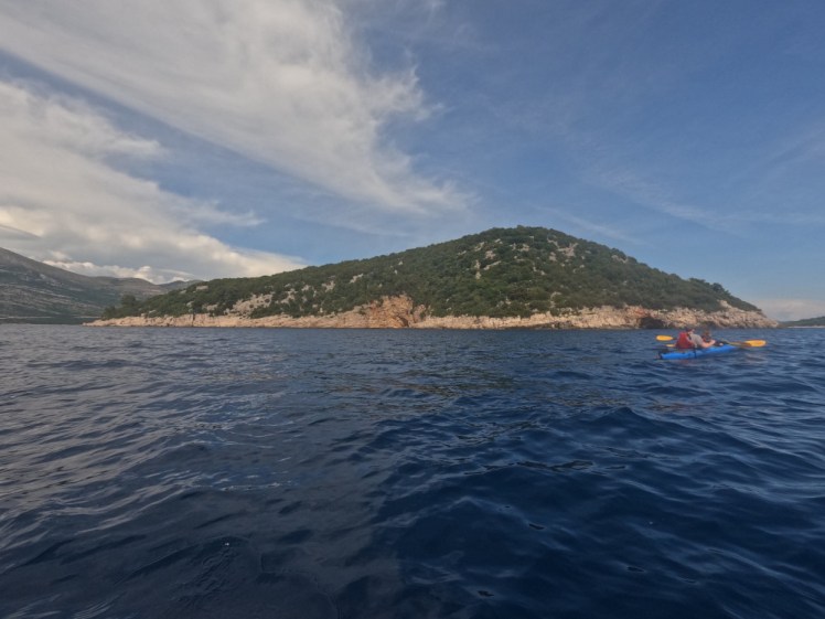 I was nervous about the time. We had about two and a half hours to get all that done, to say nothing of getting changed, packing up the kayaks and getting back to the jetty. Two and a half hours to paddle the best part of two and a half miles, in winds that have picked up a bit since the morning, when two of the five paddlers are kids under about twelve, was going to be a challenge. Plus, our guide had picked up an empty kayak from one of his colleagues. Said colleague was apparently intending to tow three empty kayaks behind him back to Lopud so ours took one of them for him. Where did his group go? Who knows! Never found out why that happened! Our guide had mentioned that if necessary, he could tow us back to Lopud but now we’d be sharing a towline with this empty kayak. I was determined not to be towed – when I did my sea kayak award training last year I thought I’d have to be towed back from Brownsea when we had a similar distance to paddle straight into a force 4 wind but when I didn’t – didn’t even think of it, didn’t break a sweat – I realised that I’m a better endurance paddler than I’d given myself credit for. In fact, if he’d had a spare towline, I might even have offered to tow one of the others myself if necessary.