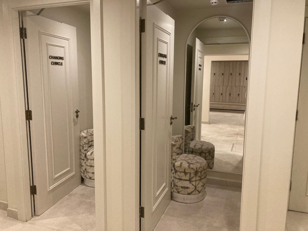 The indoor spa is very nice, dominated by a long shallow pool just deep enough and long enough to swim slow langourous lengths. It’s not an obnoxiously bright blue either, being lined with tiles that are mostly off- white with just enough blues to give it a subtle colour and a few iridescent tiles that sparkle under the low lighting. At the far end is a small sauna and a small steam room and at the opposite end, a sunken hot tub big enough to comfortably seat ten, with optional jets. Down the side of the room are loungers, separated into pairs by curtains patterned with watercolour sea creatures. The other wall has irregular narrow vertical windows in it, letting in some natural light without making it too obvious the pool overlooks the car park.