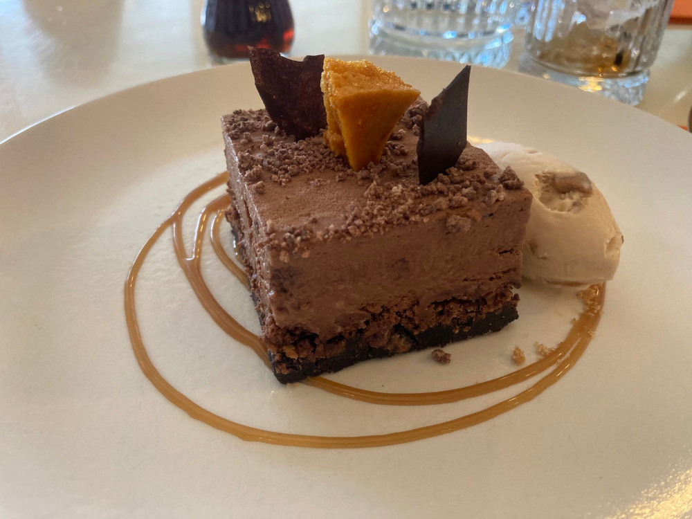 Pudding was a bit more mixed. I – normally an ice cream or chocolate brownie girl – went for the chocolate mess, which was a square of something mousse-like on a brownie-like base, topped with something crunchy, surrounded by swirls of toffee sauce, accompanied by an oval of salted caramel ice cream and decorated with biscuit crumbs. Being a simple soul, and eating it with a gold spoon, this all seemed quite sophisticated. My sister had the sticky toffee pudding, which she deemed “fine” but “if I’d just ordered this, I’d be disappointed”. We investigated the various menus on the website to find an individual price for it, which turned out to be £9 on the Sweets menu (“No.”).