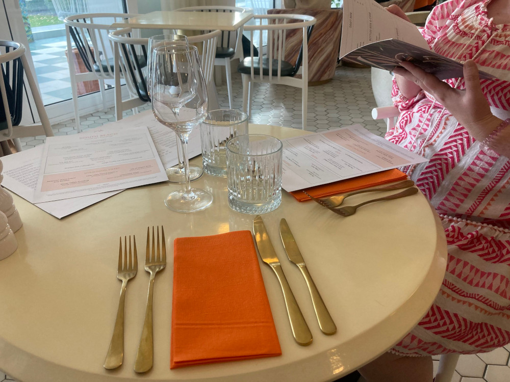 This place mixes formality and whimsy in an interesting way. The classy formal way is monochrome and beige neutrals, with maybe a dark green for a bit of variety. South Beach has orange napkins and gold cutlery, green glass water jugs, bench seating striped in green and white, comfy armchairs in orange and brown swirls and waiters in off-white chinos rather than black suits. They were able easily and comfortably to cater to my dietary requirements and my sister had the roast beef from the menu, which “has a lot more beef than you’d normally get” and surprise vegetables hiding under the Yorkshire pudding and gravy. Our package meant choosing from the £25 two-course Sunday menu but you could upgrade to get the third course as well if you wanted.
