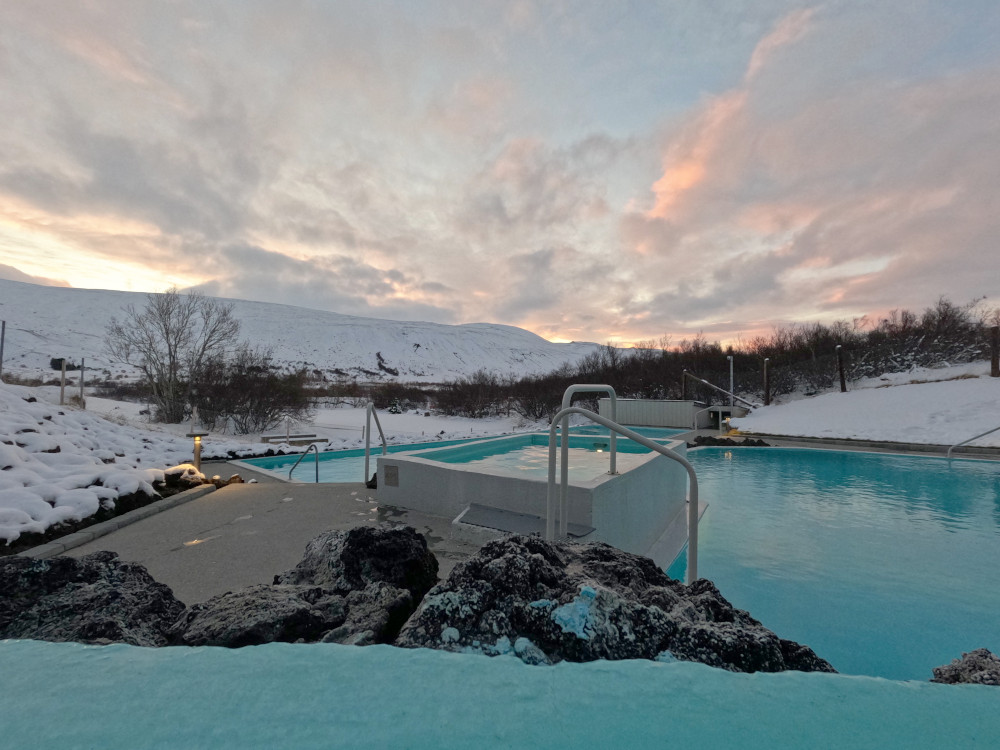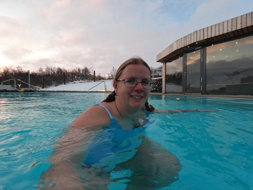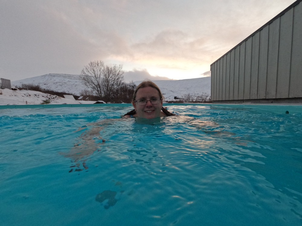 My one criticism, really, is that you have to run down the stairs from the changing rooms to the pools and in winter, when there’s a mix of ice and grit around, that’s quite unpleasant on bare feet. Had I known, I’d have brought my water shoes. I’d been at Hvammsvík only the day before and one thing I’d learned from my first visit is that you need shoes to run between the pools, so it’s not like I didn’t have suitable shoes with me, but they were back in my room in Reykjavik. I’m sure Lindin is just fine in the summer when there’s no ice or grit but in winter, you’ll want something on your feet.